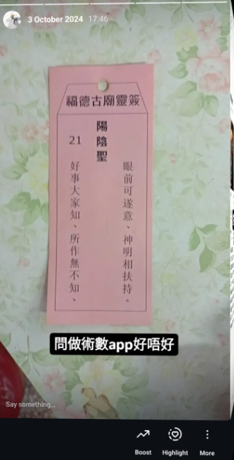 如圖中所示,乃本人於2024年10月3日於香港尖沙咀福德古廟求問相關事宜得出的籤文。